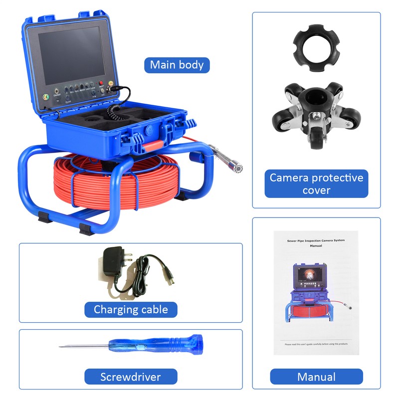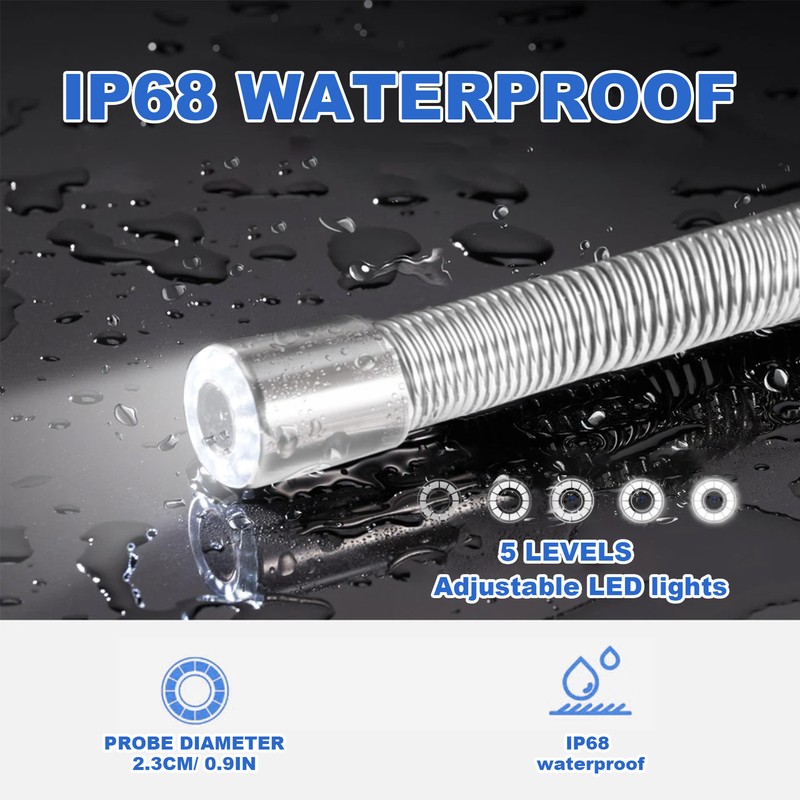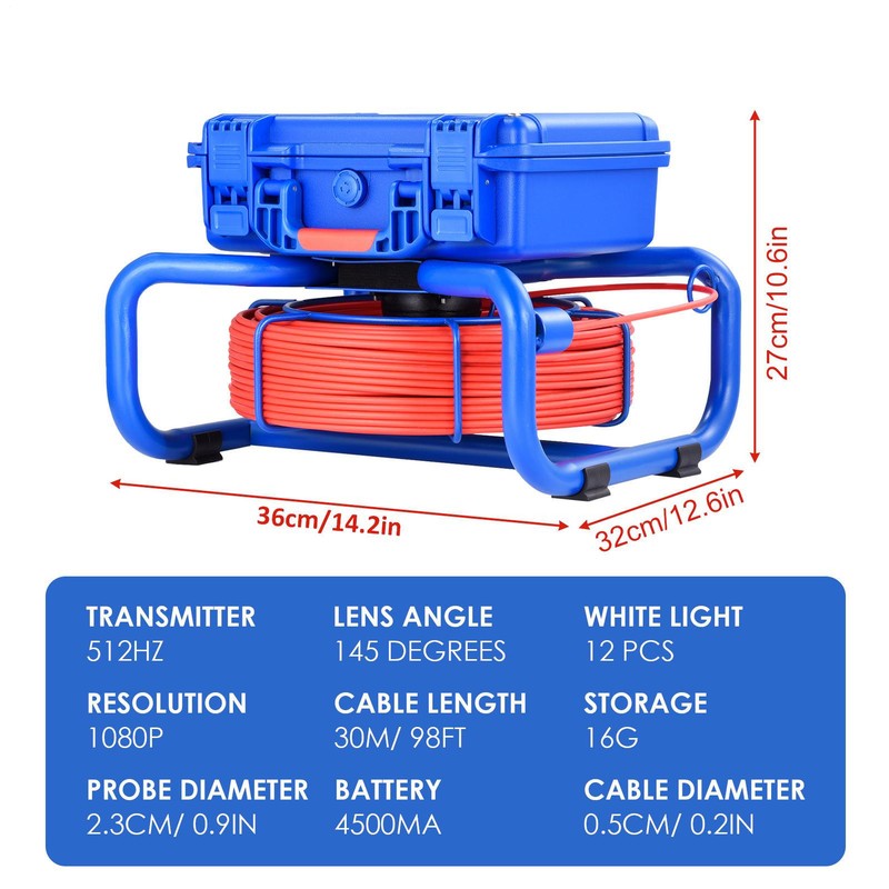 Product details: 9inAHD video screen with meter counter, camera built-in 512HZ emission self-balancing, sapphire lens, 23mm diameter stainless steel probe, HD 1080P, lens angle 145 degrees, 30m pipeline endoscope, 4500MA built-in battery with charge display, 12 white lights, 2 types of camera protective covers, 16G card. 5MM red cable.